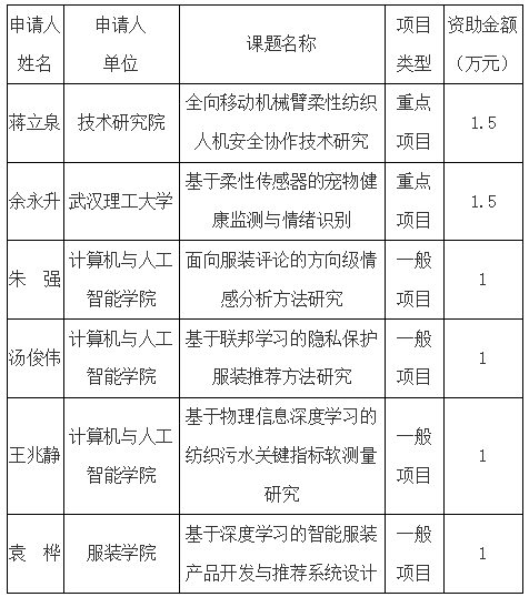 请各位获得开放课题资助的项目负责人填写《纺织服装智能化湖北省工程研究中心开放课题任务书》(附件1),于10月15日前发送至heruhan@wtu.edu.cn,并到计算机与人工智能学院院办办理相关立项手续,《纺织服装智能化湖北省工程研究中心开放课题结题报告书》见附件2。