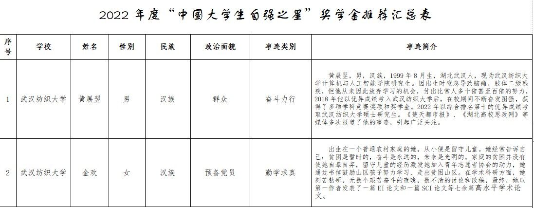 按照学校开展2022年度“中国大学生自强之星”奖学金推报工作要求,经个人申报,学院团委评审决定,拟推报黄展翌、金欢2人为学院2022年度“中国大学生自强之星”候选人,参加校级评选。