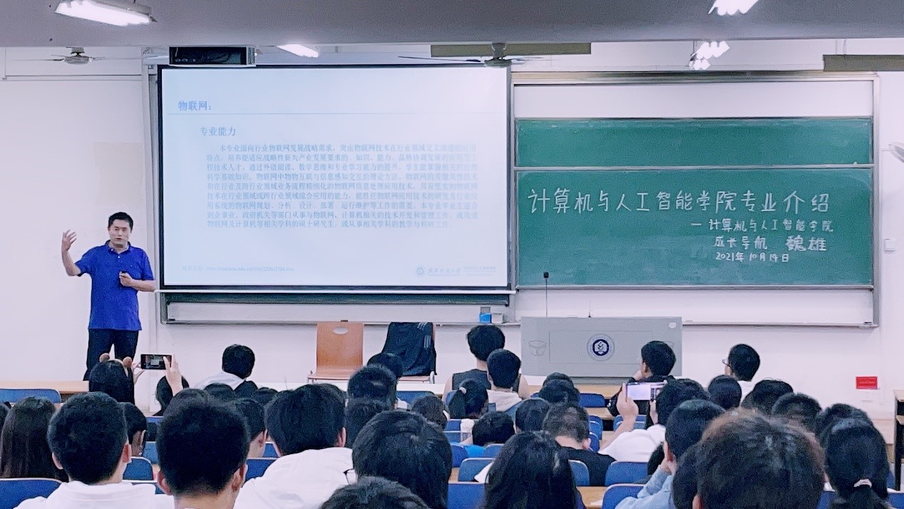 为加深同学们对计算机类各专业的了解,使同学们明确专业学习目标,10月14日下午,计算机与人工智能学院在崇志楼208、318、319教室开展计算机专业介绍会。本次会议由计算机与人工智能学院副院长魏雄主讲,新生辅导员及全体2021级新生参加了此次会议。
