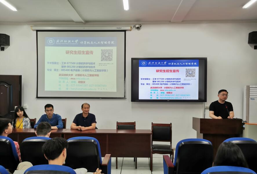 为了进一步持续提高研究生生源质量,计算机与人工智能学院启动2022年研究生招生宣传工作。5月26日,学院副院长何儒汉教授、辅导员谢旋老师一行,赴黄冈师范学院计算机学院开展研究生招生宣传工作。宣讲活动由黄冈师范学院计算机学院院长胡志华教授主持。