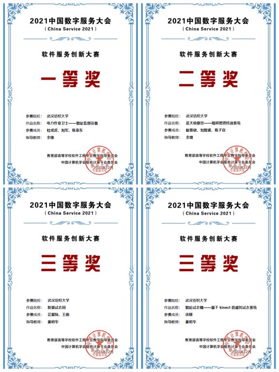 近日,由教育部高等学校软件工程专业教学指导委员会与CCF服务计算专委会共同主办,浙江大学承办的2021年“第十二届中国计算机学会服务计算学术会议”(NCSC 2021)上,在余峰、姜明华老师的指导下,中心研究生杜成虎等同学的参赛作品“电力作业卫士——智能监督设备”获得软件服务创新大赛一等奖。计算机与人工智能学院的4支代表,经过激烈角逐,最终从总决赛中脱颖而出,荣获一等奖1项、二等奖1项、三等奖2项。