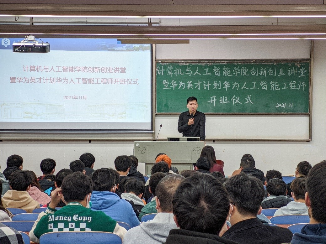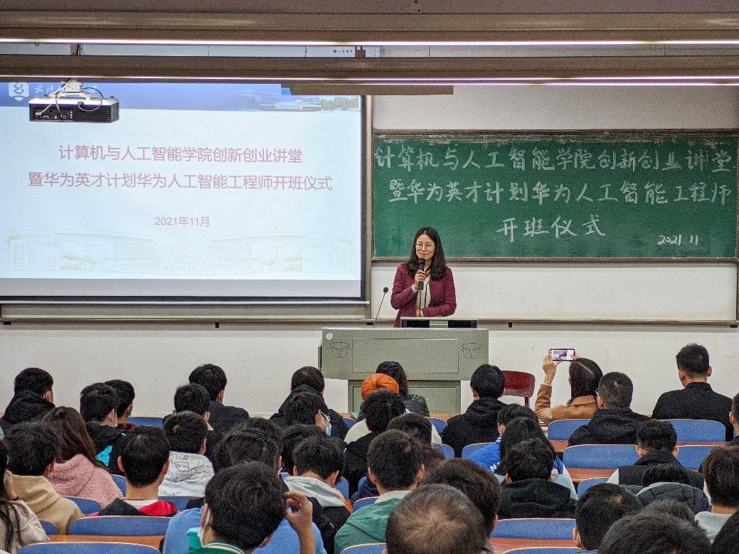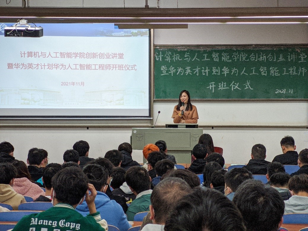 随着网络技术的发展趋势、新时代对网络技术的要求也越来越广。为了进一步增强广大学生获取专业认证证书的意识,营造浓厚的学习氛围,增加学生的实践能力,提升就业综合竞争力,满足企业对人工智能工程师的需求。11月25日下午计算机与人工智能学院创新创业讲堂暨华为英才计划华为人工智能工程师开班仪式于崇志楼T102教室如期举行,27-28日正式培训在A4030A会议室以线上线下相结合形式举行。学院院长胡新荣、武汉科云信息技术有限公司总经理刘天梅、培训部经理赵辰龙及培训班级班主任孙成艳出席了本次活动。本次活动由学院党委副书记涂耀威主持。
