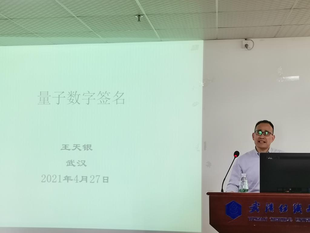 应计算机与人工智能学院邀请,4月27日下午,河南省科技创新杰出青年,河南省高校科技创新人才,洛阳师范学院王天银教授做客我校阳光论坛,此次王天银教授为我院师生做了一场主题为“量子数字签名”的学术报告,报告由计算机与人工智能学院副院长何儒汉教授主持。