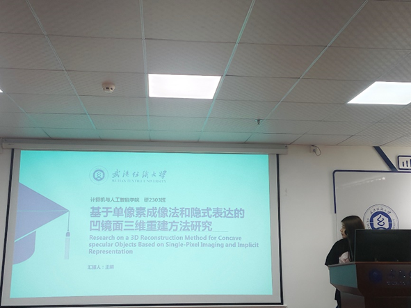 王娟同学分享的主题为“3D Reconstruction of Concave Mirror Objects via Single-Pixel Imaging and Implicit Representations”。凹镜面物体因镜面高光与多重反射,其三维重建一直是计算机视觉和光学领域难题,传统方法处理效果有限。她提出了基于单像素成像与隐式表达的分阶段重建方法,借助傅里叶频谱单像素成像技术捕获反射光线、获取点对关系,并以此为物理先验重建几何结构。仿真实验和真实数据验证显示,该方法突破传统技术局限,在复杂形状及反射干扰场景中适应性与鲁棒性优异。