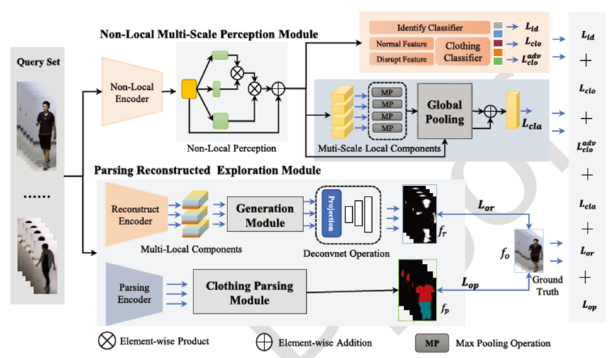 换衣行人重识别旨在匹配不同时间、不同地点、并且依着外貌不同的行人是否同一对象目标的技术,其同样在公共安全、形式破案领域具有重要的作用。本文针对现有的方法主要集中在改变服装颜色和直接重建外观上,而忽略了行人身高、体型等差异而导致识别性能降低的问题。提出了一个名为“非局部多尺度感知网络的行人解析重建”框架,包括非局部加权多尺度感知模块和行人解析重建探索模块。其中非局部加权多尺度感知模块有效地获取了行人样本的全局感受野和样本图像内非相邻像素之间的上下文相关性。行人重建解析模块用于通过服装解析模型更准确地重建人体组件,以更好地区分与服装相关或无关的特征,有效提升了换衣重识别的精度。