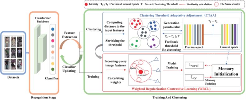 无监督行人重识别旨在无需任何数据标注的情况下,能够有效地识别不通状态下的同一目标对象,在刑事侦查、公共安全领域具有重要的作用。本文针对当前无监督聚类方法主要依赖于固定的阈值(样本点和聚类质心之间的最大距离),忽略了在连续模型优化过程中调整该阈值的重要性,而导致聚类阈值与类内间距不匹配的问题,本文提出了一种自适应聚类和加权正则化对比学习方法,主要包括聚类阈值自适应调整模块和加权正则化对比学习模块,使得模型在训练过程中自适应地调整样本实例与聚类中心的距离,有效解决了聚类阈值与模型训练进程不匹配的问题,并提升了模型收敛的速率。