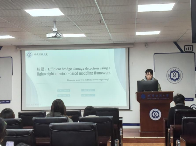 朱泳卓同学分享的主题为“Efficient Bridge Damage Detection using a Lightweight Attention-based Modeling Framework”。当前,桥梁表面损伤的实时评估对保障基础设施安全至关重要。然而,现有方法常面临两难:复杂模型难以在资源受限系统上运行,而轻量模型又无法保证足够的检测精度。桥梁损伤类型多样(如裂缝、钢筋外露、风化)及数据采集环境复杂,进一步增加了检测难度。为此,他们提出了一种高效的桥梁损伤检测框架LFETNet。该网络包含三个核心模块:(1)多尺度特征学习模块,抑制冗余损伤特征;(2)轻量级特征金字塔模块,高效融合多尺度信息;(3)内嵌三重注意力检测模块,聚焦关键特征,抑制无关信息。在MCDS和CODEBRIM数据集上的实验表明,该模型优势明显:平均精度提升5.6%,计算负载降低13.6%,并能以45帧/秒的速度进行实时检测。其计算复杂度与输入数据量呈线性关系,非常适合部署于边缘设备。