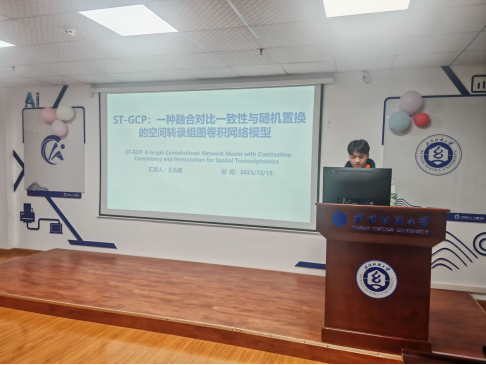 王永康同学分享的主题为“ST-GCP: A Graph Convolutional Network Model with Contrastive Consistency and Permutation for Spatial Transcriptomics”。空间转录组(ST)技术是一种强大的方法,能够同时保留基因表达谱和空间位置信息,从而促进对组织结构和功能的深入探索。然而,许多现有的计算方法往往依赖带标注的ST数据,并忽视了丰富的空间信息,导致其表示能力有限,聚类效果不理想。本文提出一个面向ST数据的自监督图表示学习框架ST-GCP,并引入结构-特征扰动机制。首先,ST-GCP在特征层面对基因表达矩阵进行随机重排,并在空间邻接网络中执行随机边丢弃,从而构建两个互补的增强图视图。随后,ST-GCP使用两层图卷积网络编码器-解码器来提取空间表示并重建基因表达。最后,基于余弦相似度的对比目标对齐视图特定的表示,整体损失同时优化重建精度和对比一致性,从而在共享的低维空间中耦合图拓扑结构与转录组信息。在多个ST数据集上的实验结果表明,ST-GCP能够挖掘生物学上具有重要意义的模式,如肿瘤异质性、脑发育结构以及细胞发育轨迹等。