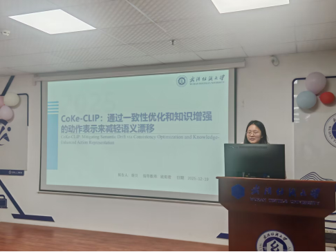 胡贝同学分享的主题为“CoKe-CLIP: Mitigating Semantic Drift via Consistency Optimization and Knowledge-Enhanced Action Representation”。近年来,随着多模态大模型(MLLM)的快速发展,越来越多研究开始探索将其生成的额外知识引入视频动作识别任务,以增强视觉语言模型(VLM)的跨模态理解能力。然而,由MLLM自动生成的额外知识存在语义漂移(SemanticDrift)问题,主要表现为两种形式:一是生成内容可能不准确,二是在相邻帧之间容易产生不连贯的额外知识。为了解决这一挑战,本文提出了一种面向动作识别的额外知识一致性优化框架coke-CLIP,从语义增强、局部感知与一致性优化三个方面系统缓解语义漂移带来的干扰。具体地,知识驱动文本嵌入模块(KTE)融合类别标签与MLLM生成额外知识,增强文本编码器对细粒度语义的建模能力。双通道动态感知模块(BDP)引入边缘图辅助视觉模型聚焦局部结构变化,提升动作区域感知能力。自适应时序优化模块(ATR)通过帧间加权优化机制,缓解单帧额外知识带来的语义漂移,强化时序一致性监督。实验结果表明,本文方法在Charades、HMDB51和UCF101等动作识别数据集上达到了当前最先进的精度。