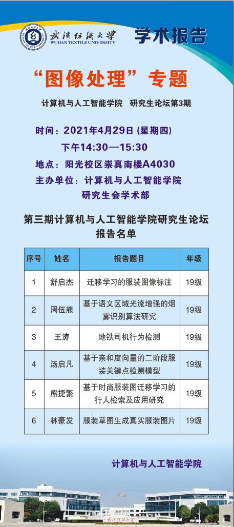 为了提高研究生的学术素养,营造浓厚的学术氛围,5月27日下午2:00,计算机与人工智能学院第五期研究生论坛在崇真南楼A北1017举办。本次论坛由19级研究生张义欣、董学良、郑传锟、陈浩川、李卓文、唐经主讲。本次活动由计算机与人工智能学院研究生会学术部组织。