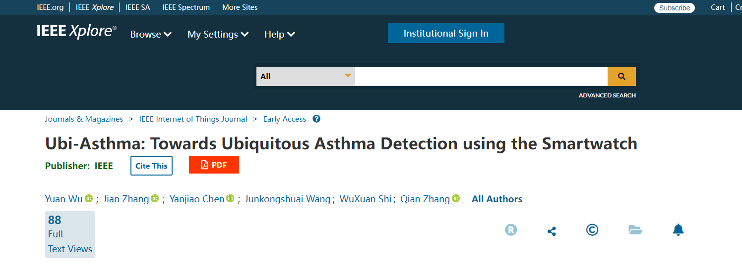 在Ubi-Asthma: Towards Ubiquitous Asthma Detection using the Smartwatch一文中,吴渊博士提出了一种基于超声波的全场景下的人体呼吸检测方法,并将提取的呼吸信号用于实时检测哮喘病,为智慧医疗的应用提供了理论支撑。