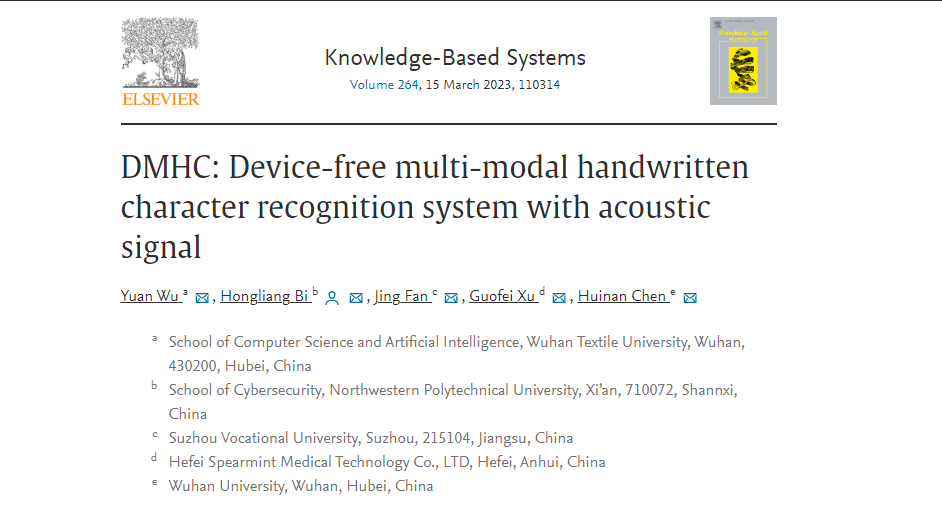 近日,计算机与人工智能学院移动计算与智能穿戴团队青年教师吴渊博士在物联网与智慧医疗、物联网与人机交互方向取得了重要的研究进展。相关成果分别以“Ubi-Asthma: Towards Ubiquitous Asthma Detection using the Smartwatch”和“DMHC: Device-free multi-modal handwritten character recognition system with acoustic signal”为题发表在计算机领域中科院一区Top期刊《IEEE Internet of Things Journal》(ISSN:2327-4662)和中科院一区Top期刊《Knowledge-Based Systems》(ISSN:0950-7051)上。两篇论文的第一单位为武汉纺织大学,第一作者为吴渊博士。