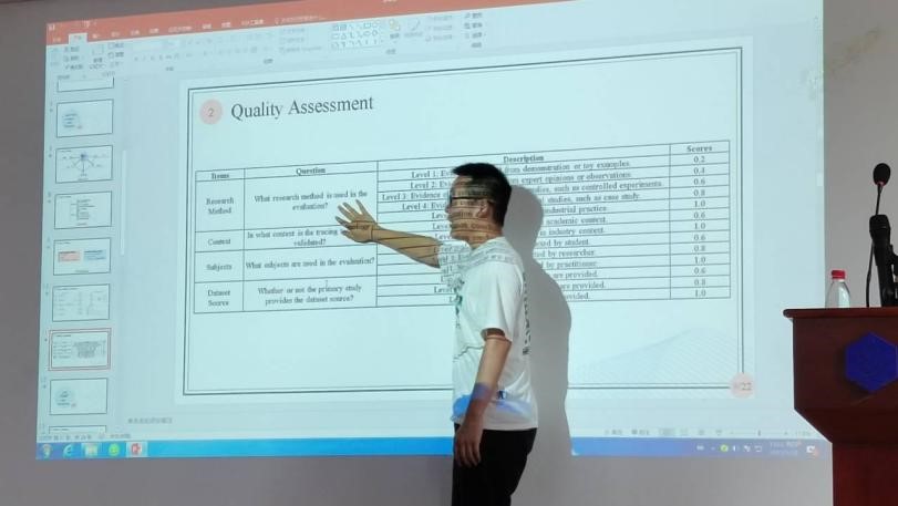李幸阜的报告题目是“Applications of Machine Learning in Requirements Traceability: A Systematic Mapping Study”。他主要报告关于机器学习(ML)在需求跟踪(RT)中应用的系统文献综述。他指出,需求跟踪对于软件维护、需求管理和需求变更影响分析等至关重要,机器学习技术在RT中的应用受到了广泛的关注。研究结果表明有32种ML技术和7种用于建立跟踪链接的增强策略。在研究论文使用的众多的数据集中开源数据集是最受欢迎的,这大大提高了研究的可复现性。并且这些原始研究的总体质量处于良好水平。