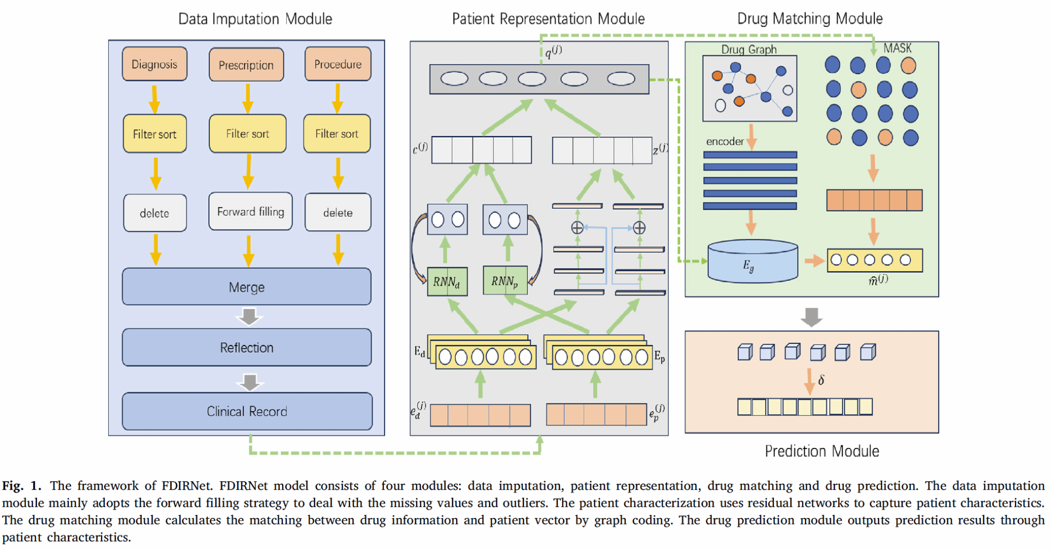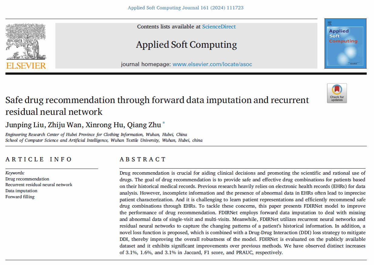 工作二:Safe drug recommendation through forward data imputation and recurrent residual neural network发表在期刊《Applied Soft Computing》。由于医疗文本广泛存在数据缺失问题,使得患者的健康状态画像不准确,从而导致患者安全用药存在隐患,该研究工作提出了一种前向数据填充方法,以通过引入药物-药物相互作用领域知识图谱确保推荐药物组合的安全性。