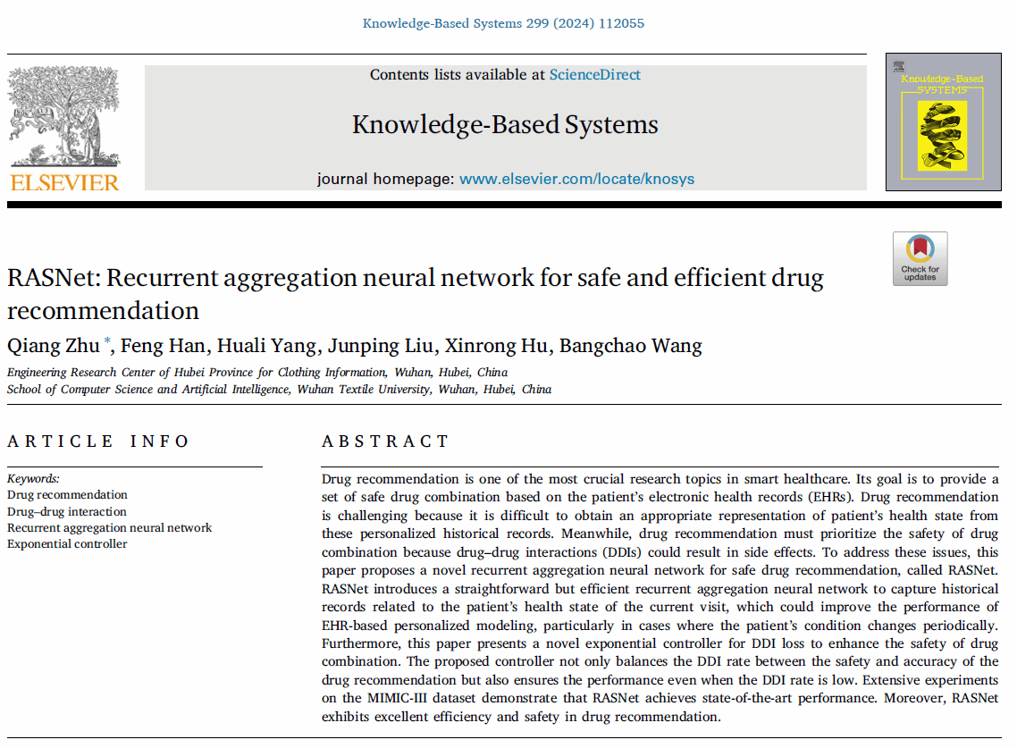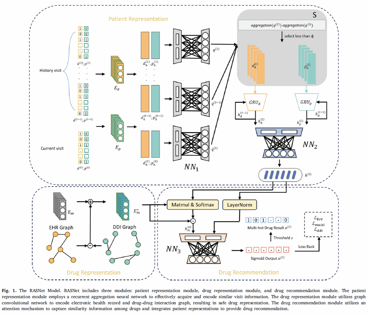 工作三:RASNet: Recurrent aggregation neural network for safe and efficient drug Recommendation发表在期刊《Knowledge-Based Systems》。长期慢性病患者的病情会出现反复,如何基于电子病历对此类患者建模以精准推荐用药是一个难题。该研究提出了一种新颖的循环聚合神经网络,可以有效解决因病情反复引入的数据噪声问题。此外,该研究提出了一种新型指数控制器可有效平衡药物推荐的匹配精度和安全性。