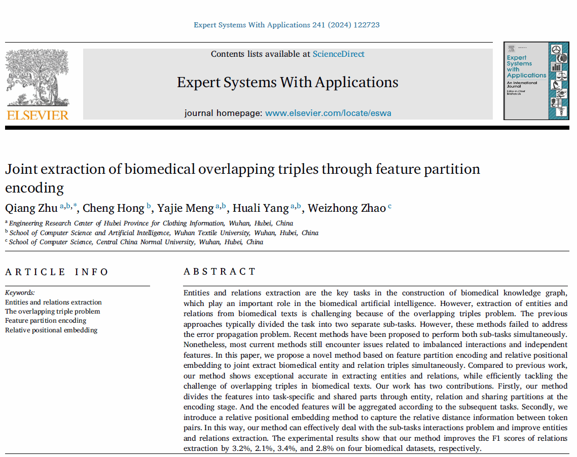 工作一:Joint extraction of biomedical overlapping triples through feature partition encoding发表在期刊《Expert Systems with Applications》。该研究工作提出了一种基于特征分区的实体-关系三元组抽取模型,以解决复杂医学文本的实体重叠难题,从而为信息抽取和构建高质量知识图谱提供了一种可行的解决方案。