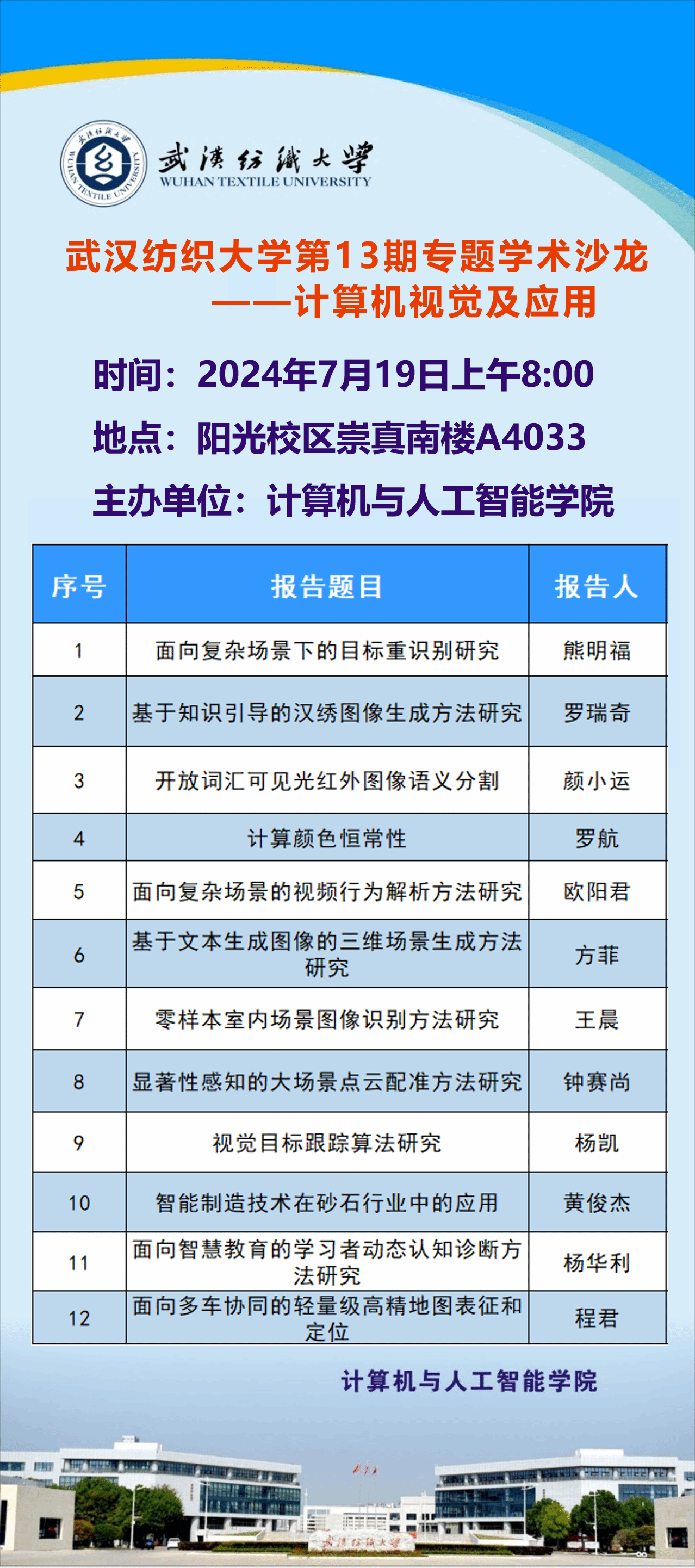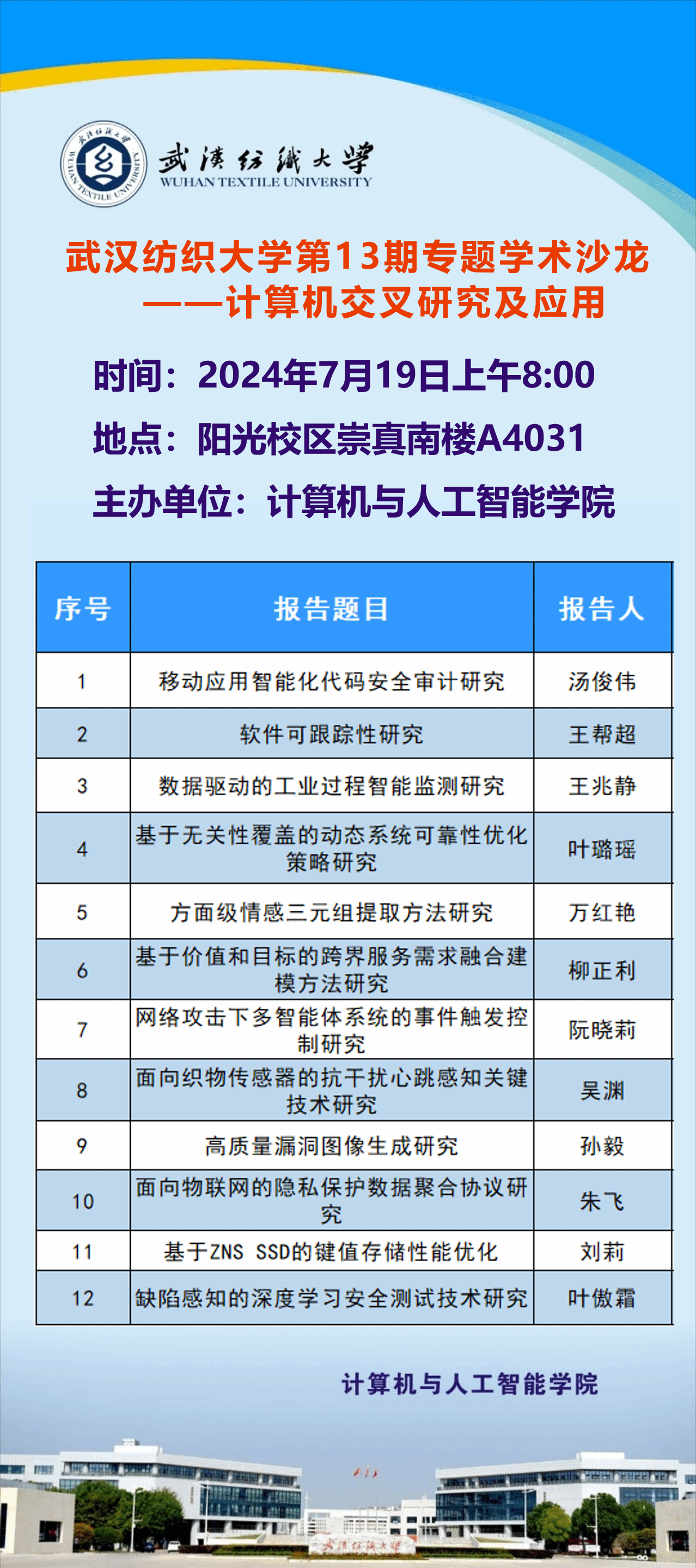 武汉纺织大学计算机与人工智能学院 地址:武汉市江夏区阳光大道1号电话:(027)59367297 邮编:430200