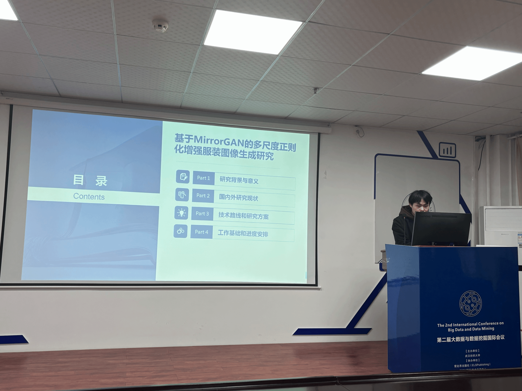朱时伟同学分享的主题是“基于MirrorGAN的多尺度正则化增强服装图像生成方法研究”。他提出了一个结合MirrorGAN和多尺度正则化的方法,通过提取不同层次的特征和使用正则化技术来提高图像的质量和多样性。这种方法在处理复杂背景和细节时比传统MirrorGAN更强,因为它加入了多尺度卷积层,并用L1和L2正则化防止过拟合,增强了模型的泛化能力。实验显示,他的这种方法在多个服装数据集上有效提高了图像质量、多样性和语义一致性。