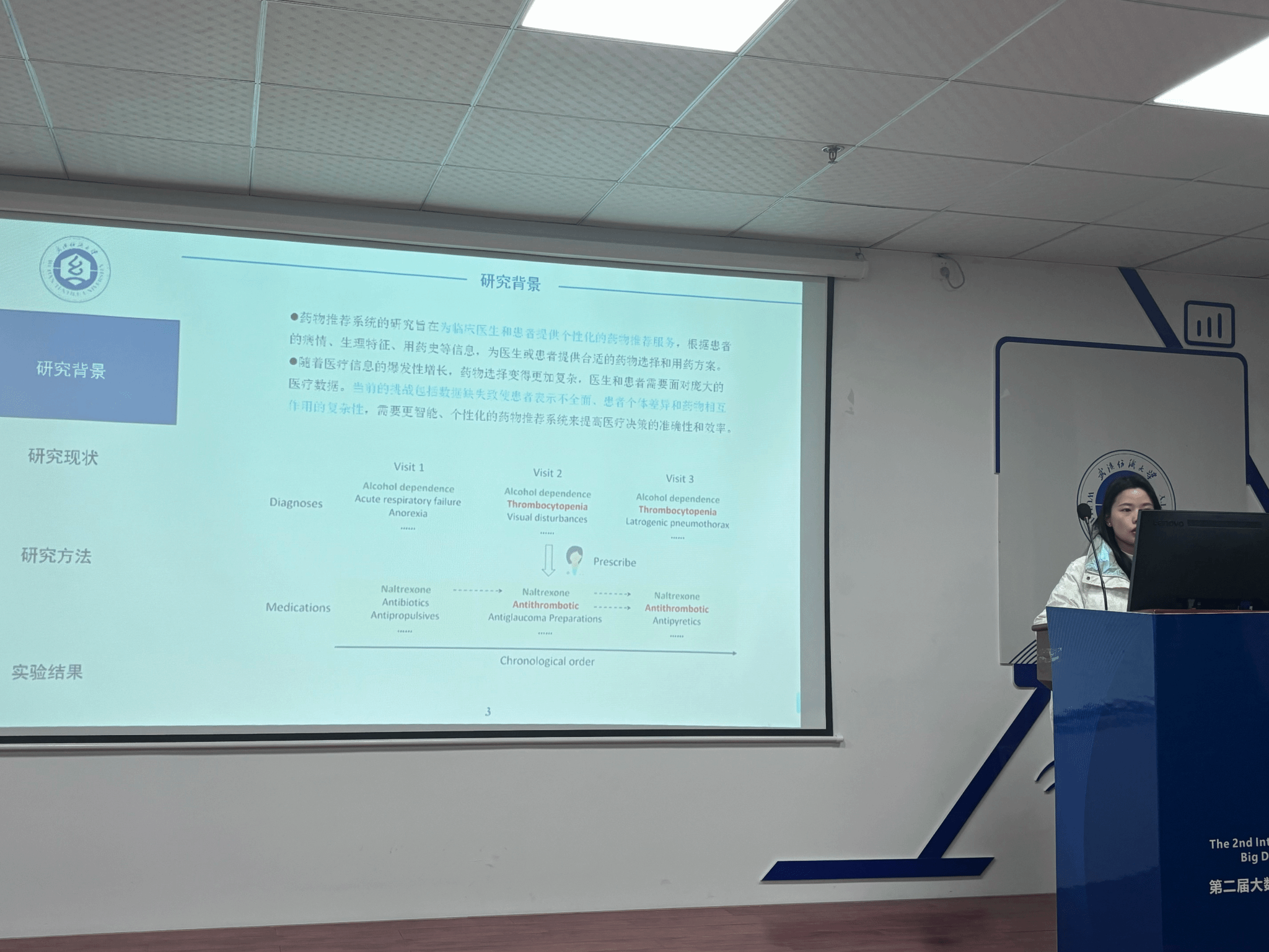 万志菊同学分享的主题是“基于前向数据插补和递归残差神经网络的安全药物推荐”。她强调药物推荐在辅助临床决策和促进合理用药中的重要性,指出基于患者历史病历提供安全有效药物组合的必要性。她提到,不完整的电子健康记录和异常数据常常导致患者表征不准确,而她的研究提出的FDIRNet模型旨在通过前向数据插补和递归残差神经网络提高药物推荐的性能。