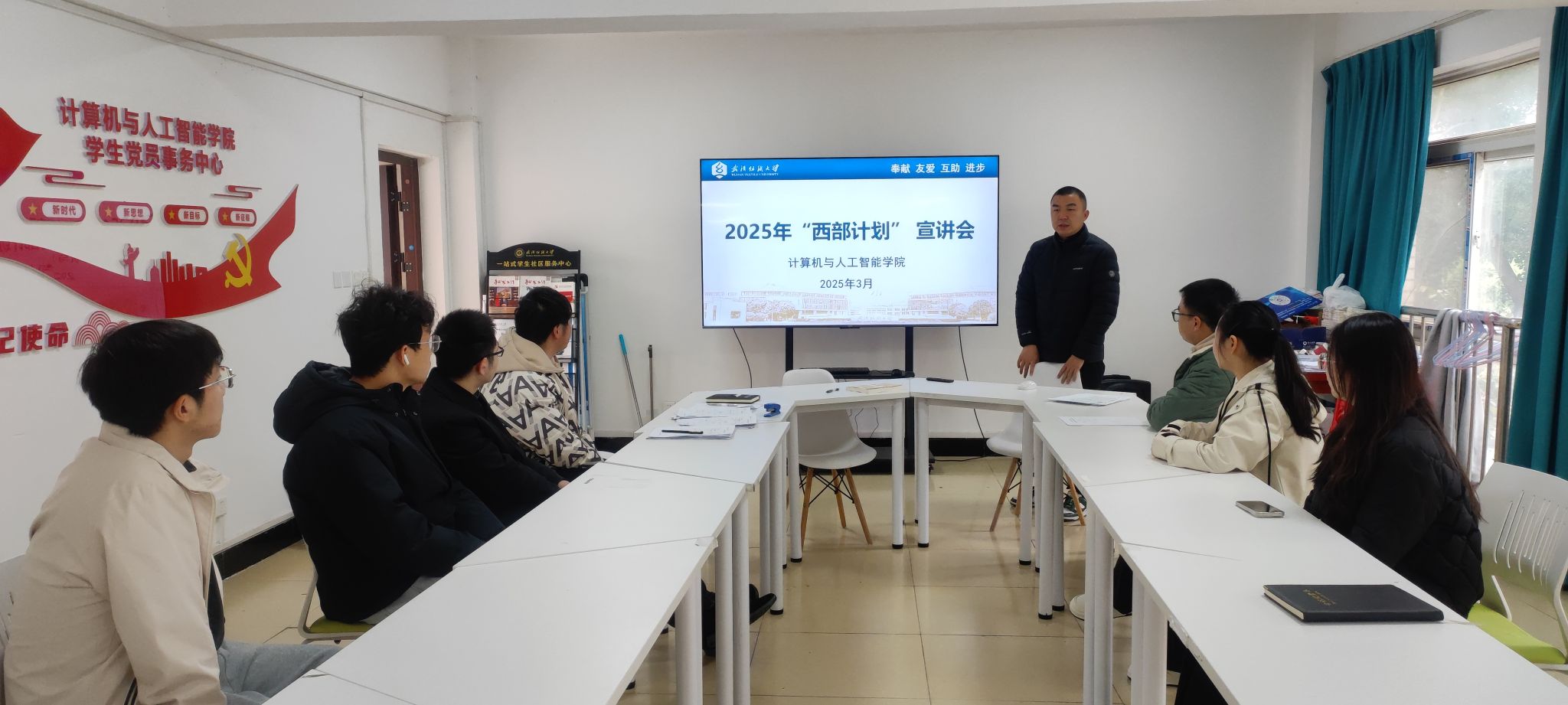 为切实做好2025届毕业生就业精准化指导和帮扶工作,引导广大学子厚植家国情怀,报效祖国,建功西部,3月11日上午,计算机与人工智能学院在五栋“1024学生服务驿站”成功举办了2025年西部计划宣讲会。本次活动由学院学生工作办公室主办,邀请2024级辅导员汤若釴老师主讲,毕业班辅导员谢瑞清、张栋及近30名毕业生参与。