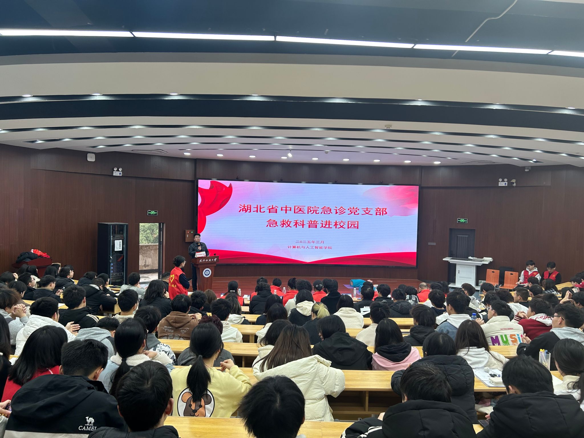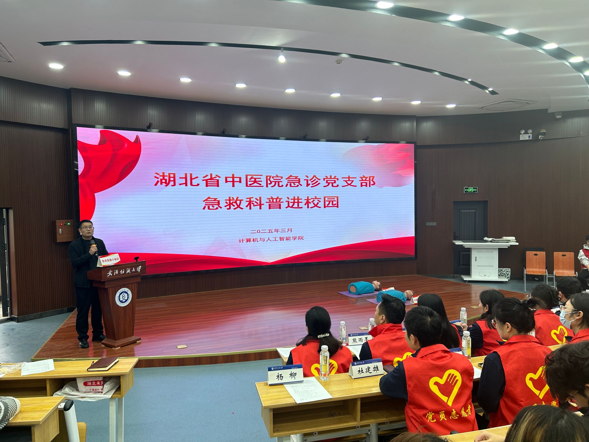 活动在湖北省中医院的宣传片播放中拉开帷幕,师生们对省中医院有了更直观且深入的了解。随后,来自湖北省中医院的12名急救培训专家依次登场,带来精彩纷呈的宣讲与培训内容。内科医生包婷婷凭借丰富的临床经验,通过生动的案例和专业的知识讲解,让师生们清晰地掌握了急性心梗的识别方法以及在紧急时刻的正确急救措施,这对于在校园中及时应对突发心脏疾病至关重要。护理专家陈红则聚焦于心理健康领域,深入剖析抑郁症的识别与预防要点,帮助师生们更好地关注自身和他人的心理健康状态,增强心理调适能力。