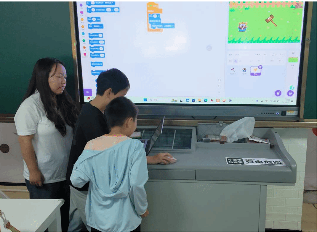 “尖嘴尖牙齿,爱在地里钻,庄稼被它吃,农民恨又烦 —— 猜猜这是谁?” 实践团成员刘襄郧以谜语切入,带领孩子们化身 “农场小卫士”,通过 Scratch 编程搭建 “打地鼠” 互动游戏。从设计地鼠随机出洞的路径算法,到编写锤子跟随鼠标击打的指令逻辑,再到实现积分累计功能,孩子们综合运用 “事件模块”“控制模块”“变量模块”,让虚拟农场中的地鼠 “闻锤丧胆”。“ 随着游戏背景音乐的加入与 “双人对战模式” 的创意拓展,课堂秒变欢乐竞技场。我的锤子能精准打地鼠,还能计算得分!”