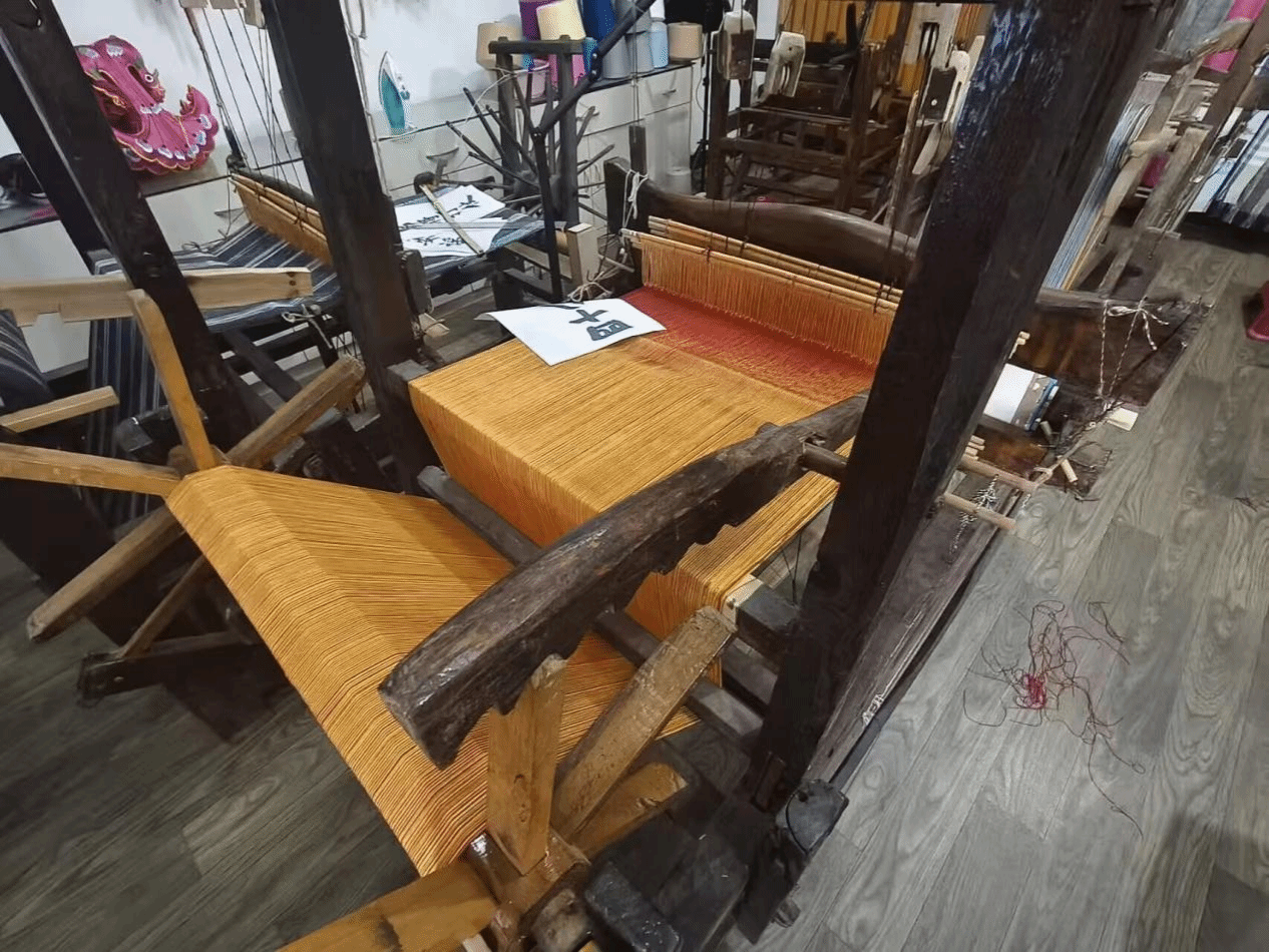 随后,实践团前往红安县非物质文化遗产保护传承基地,作为大布传统纺织技艺非遗工坊与红安福锦织绣文化传播公司所在地,陈列架摆满的荣誉证书见证红安纺织非遗传承的辉煌成就。静静伫立古老的织布机,默默讲述纺织工艺悠久历史。队员们通过与工作人员交流,详细深入了解纺织工艺流程,调研非遗工坊运营状况,探究红色文旅对本地纺织产业的带动效应。