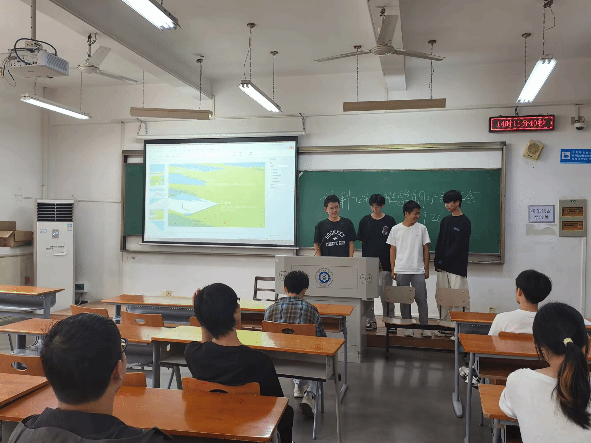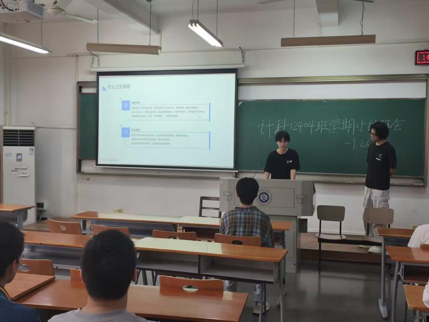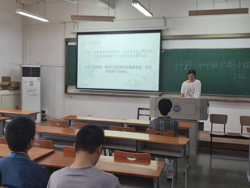 为全面总结班级建设成果,促进寝室间学习交流,9月26日下午,计算机类12404班在3号教学楼204教室举行2024-2025学年第一学期总结交流会。本次班会创新采用“寝室长汇报制”,由全班8个寝室的同学依次登台总结。班主任余锋老师和辅导员李港老师共同参与,班会由班长毛超强主持。