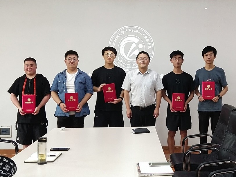 与人会人员一起观看了受表彰的5位同学的微视频,涂耀威同他们交流视频制作过程中的细节,并从视频形式、视频剪辑、视频内容、整体观感四个方面点评了每位同学的视频。受表彰的5位同学也讲述了各自在制作微视频过程中的心得体会,其中学校“感动纺大青春力量榜样人物”获得者18级成振瑞同学特别提到制作宣传视频应考虑受众群体及其需求,针对需求将视频中的特定部分进行突出优化。他表示在制作视频之前应进行大致规划,积极借鉴网络上相同类型的视频的优点,运用到自己的视频当中。涂耀威为受表彰的成振瑞、朱思格、王润鹏、郭延冰、潘建伟5位同学颁发荣誉证书并合影留念。
