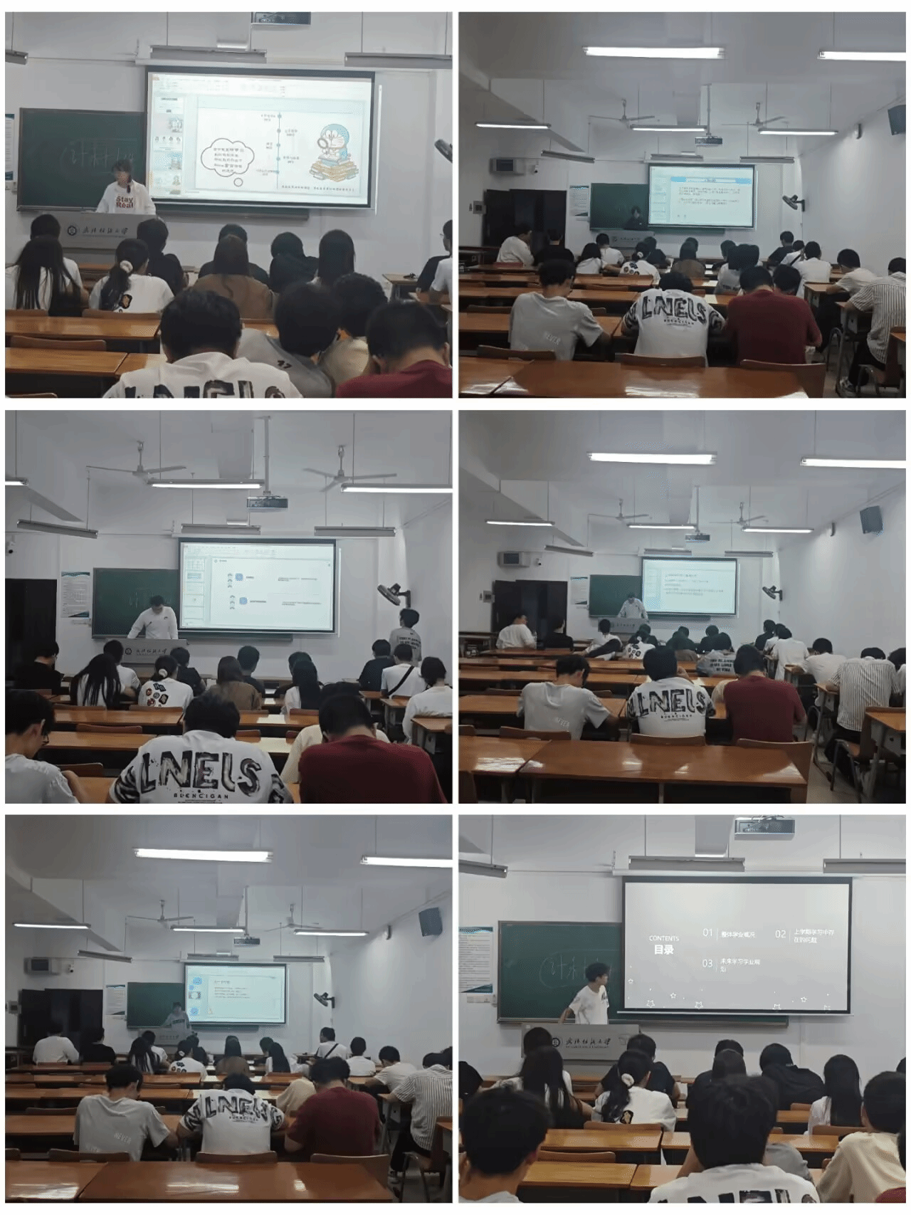 索一心汇报学业无挂科、考勤良好,社团经历提升了个人能力,同时坦言学习规划未落地且易紧张,未来将平衡规划、了解就业信息并培养自信;转专业的胡芹展示了重合课程成绩与多部门实践收获,计划补修专业、明确职业方向,还分享爱好并期待交友。此外,王家康、程洲、管业新、郑鑫、汤嘉乐等同学也依次分享学业情况:王家康编程类课程掌握较好,未来以就业为目标补足综合能力;程洲多门课程成绩优异且参与多项活动,将全力准备考研与提升专业技能;管业新上学期学习出勤良好,完成任务的同时在竞赛中获佳绩、收获志愿荣誉,未来计划学好课程、参加竞赛并攻克英语四级;郑鑫顺利完成学业任务并反思不足,计划优化学习管理;汤嘉乐部分课程成绩亮眼但存在学科短板,将制定计划补足;石轩无挂科但部分科目待提升,会针对性学习并为考研和编程能力努力;胡鼎文学业有优有缺,课外收获丰富,已选定考研院校并制定计划提升能力。
