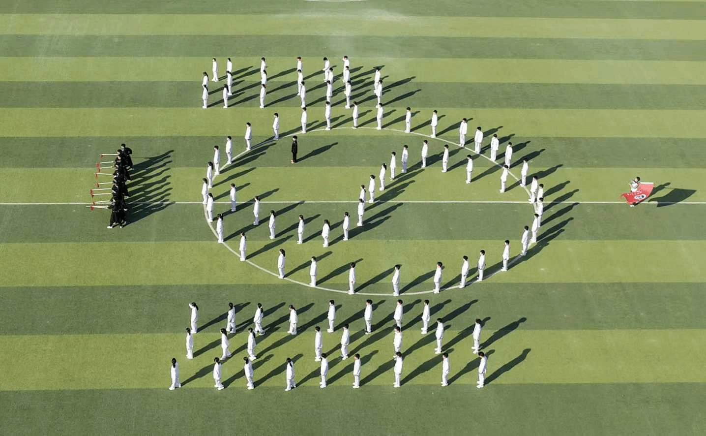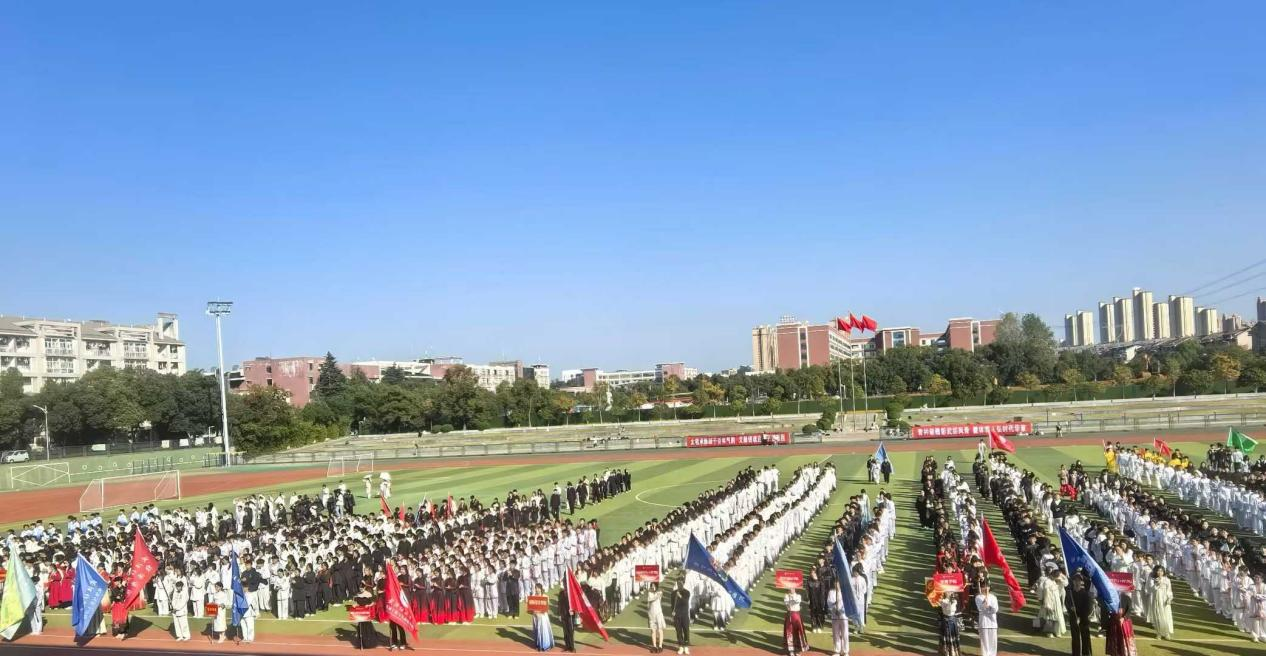 赛场上,各学院方阵队员身着素雅汉服,手持院旗,步履从容。旗帜在风中轻扬,如云卷云舒,为赛场铺陈出一幅流动的典雅画卷。