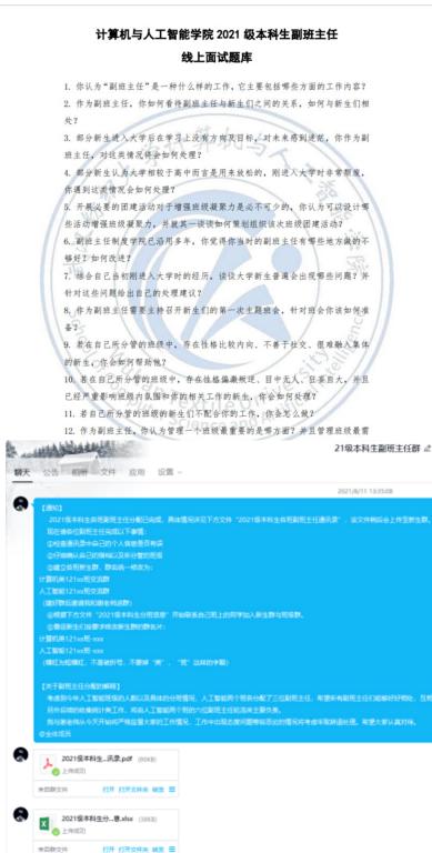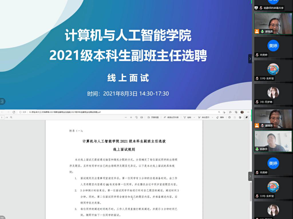 为使新生尽快适应大学生活,及时解答新生对大学的各类疑问,帮助新生解决刚进入大学时日常生活和学习上出现的问题。学院于7月5日面向全院本科生发布了《关于招聘2021级本科生副班主任的通知》。经过一个月的组织筹备及报名人员资格审查确定复试资格后,学院于8月3日下午正式举行了“计算机与人工智能学院2021级本科生副班主任选聘线上复试”,最终聘用共计30位副班主任。