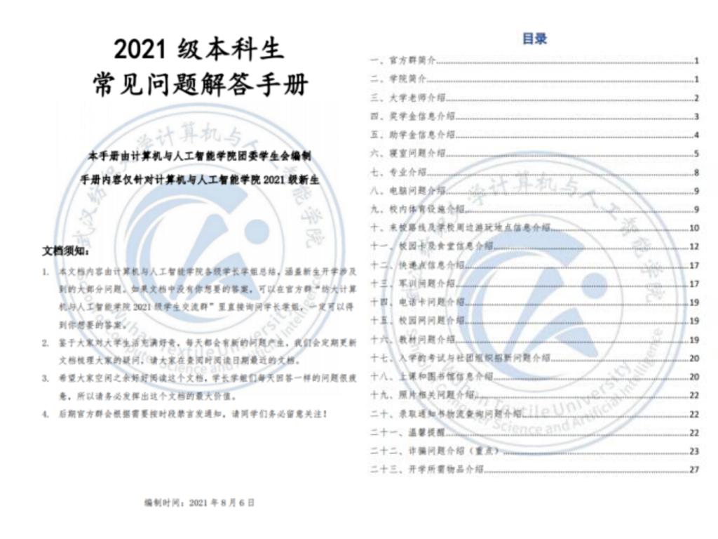 为使新生在有问题时能够及时获得帮助,院学生会主席团成员迅速根据以往答疑手册,综合实际情况,于8月6日完成了《计智学院2021级新生常见问题解答》手册的编写工作。该手册从大学生活的各方面为新生作了详细的介绍,旨在为新生的问题提供最为详细、完整的解答。