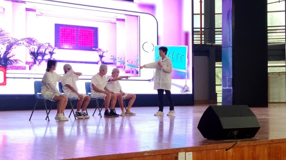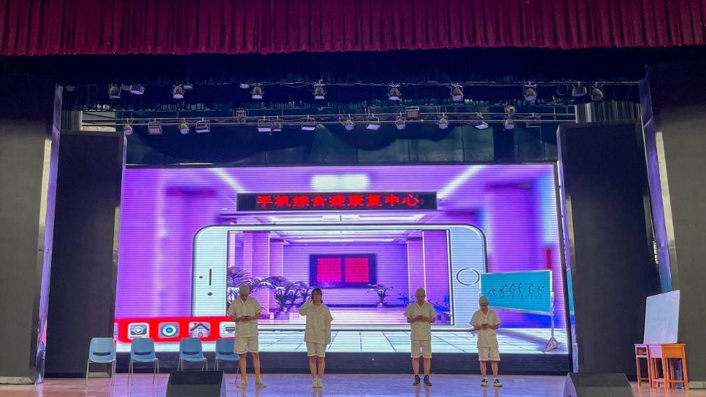《手机综合症》心理剧虚构了一个手机精神病院,患者则是手机的重度依赖者。通过描绘患者和医师的互动和冲突,来体现这些患者对手机的依赖之深和沉迷手机对他们的伤害。最后患者们被亲情的力量所感化,认识到了冰冷的机器无论如何也无法代替亲情的温暖,升华了主题。2020级平常、范梦琳、瞿成浩、张国梁、温浩宇、乐宏奕等参赛选手们配合默契,台词诙谐幽默,并辅以PPT演示文稿、背景音乐、配音等手段使表演更具感染力、吸引力。