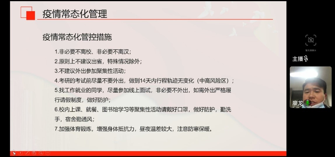 廖老师向大家重申了学校疫情常态化相关管理措施,强调每位同学要严格遵守每日健康打卡制度,确保学院能够及时了解到大家的健康状况。他还强调,学院严格规范在校生的请假离校制度,每位同学申请离校要做到事出有因、行程透明、按时返校,同时在校内外做好个人健康防护,积极配合防疫工作。