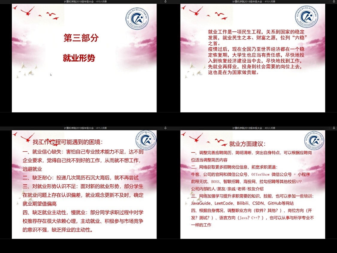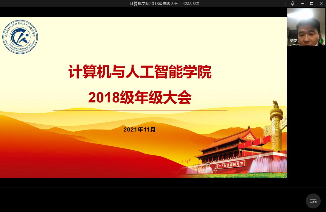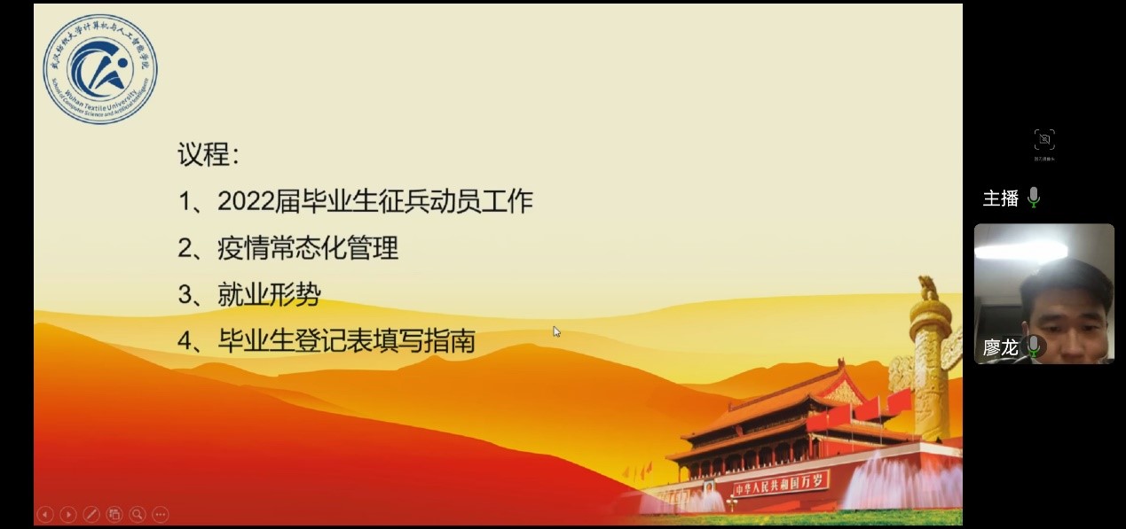 为加强学生在校期间日常管理,做好2022届毕业生征兵动员工作,同时在就业方面给予毕业生建议与帮助,避免产生就业焦虑,计算机与人工智能学院于11月25日晚19:30通过线上会议的方式召开了2018级年级大会,18级辅导员蔡文婷、廖龙以及18级全体学生参与了本次会议。