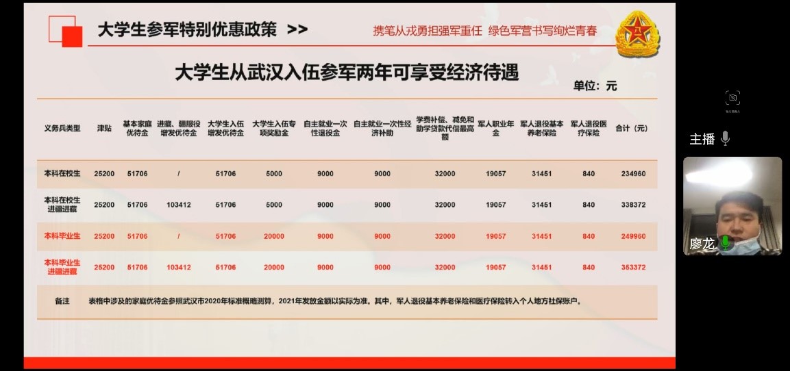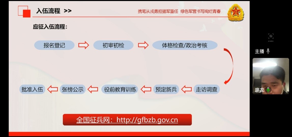 会上,廖老师从兵种、应征报名时间、应征入伍基本条件、入伍流程与大学生参军特别优惠政策五大方面为同学们进行了详细解读,使同学们对应征入伍的相关政策有了全面的了解,对参军入伍有了新的认识,对于大学生来说,参军入伍是一次难得的成长经历,廖老师鼓励同学们积极响应国家号召,踊跃报名,为国防建设奉献青春力量,为学校和学院增光添彩。