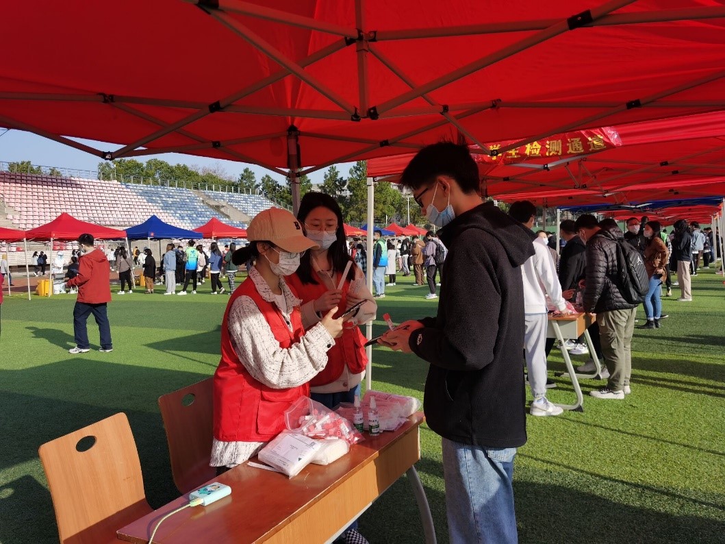 每值检测当天,志愿者们就根据学校的统一要求及安排提前到达自己的工作岗位待命,许多教职工、同学也早早来到核酸监测点,自觉地在各检测台前排队等候。检测期间,学院的老师们身先士卒,带领志愿者们在现场把控秩序,引导排队师生有序进行核酸检测。现场也有同学在完成核酸检测后也临时加入了志愿服务的队伍,阳光强烈,志愿者们互帮互助,将温暖传递。