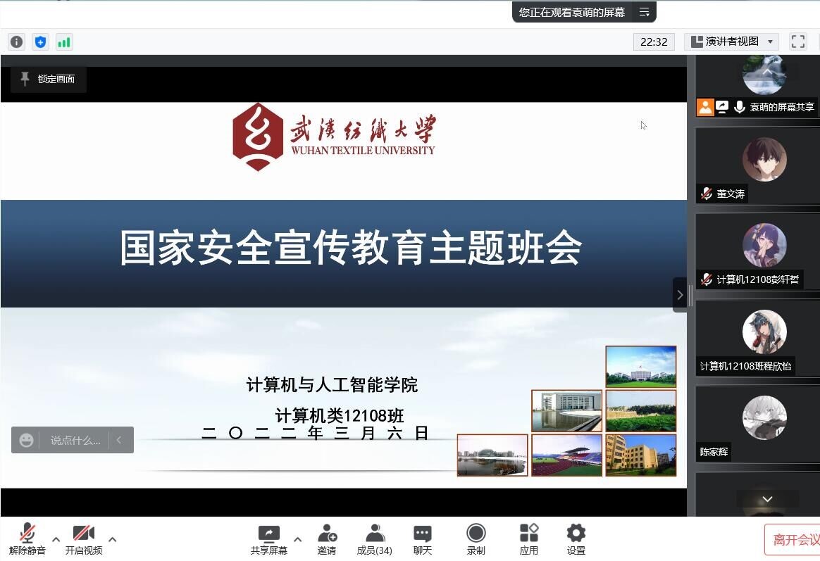 为深刻认识党的百年奋斗在维护国家安全上的重大成就和历史经验,进一步认清国家安全形势,引导广大学生理解中华民族命运与国家关系,践行总体国家安全观,将国家安全教育融入学生日常教育活动中来。计算机学院于3月6日晚点名班会时间,积极组织各年级开展了“开学第一课”国家安全宣传教育活动。
