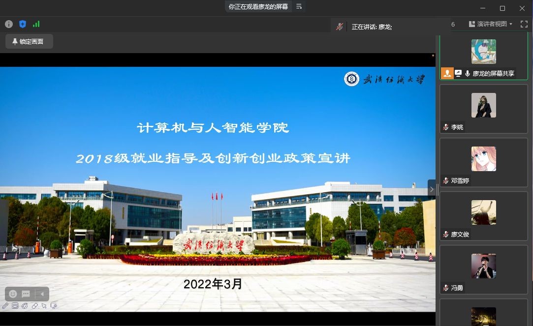 为加大学生就业创业政策的宣传力度,更好的帮助学生了解就业、创业政策,树立正确的就业、创业观念,给学生提供更加专业的就业指导,营造浓厚的就业创业氛围,3月底至4月上旬,计算机与人工智能学院各班通过线上线下两种模式开展了就业创业政策宣讲主题班会。
