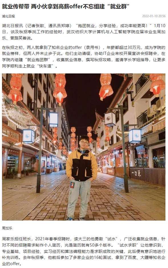 近年来,武汉纺织大学计算机与人工智能学院较好完成学校毕业生去向落实率指标,学生就业薪酬和质量稳居学校前列。《湖北日报》2022年1月11日以《就业传帮带 两小伙拿到高薪offer不忘组建“就业群”》为题,报道了我院学生高薪就业情况。