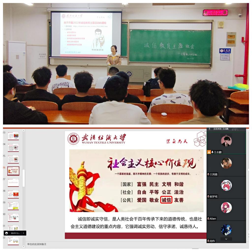 活动中,以播放PPT,视频等形式开展诚信教育活动,重温习近平总书记的多次讲话——小信成则大信立,诚信为人之本,要重信守诺,不要言而无信。此外,同学们还从考试诚信,学术诚信,就业诚信,还贷诚信,防疫诚信等多个方面,以及违反诚信的案例和后果,让同学们意识到做一个诚信之人的重要性。同学们结合身边实际,积极发言,提出自己对诚信的理解和观点,表示要做一个诚实守信的人,做一名有理想,有本领,有担当的新时代大学生。
