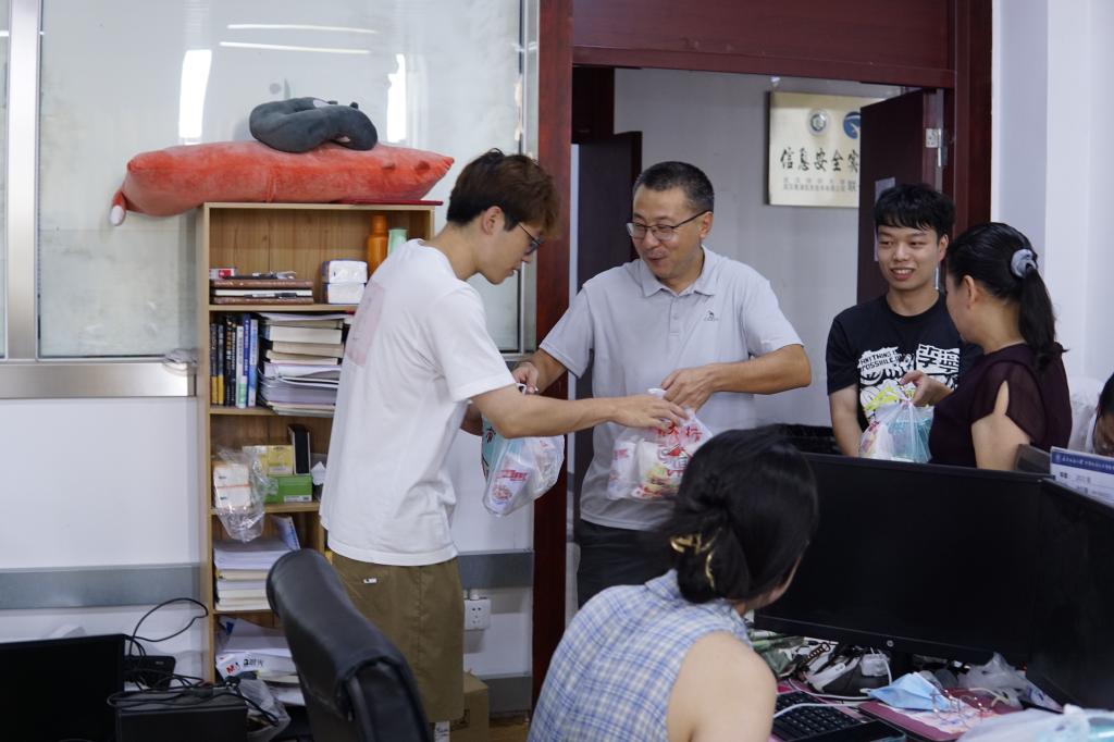 夏日慰问寄真情,浓浓关爱暖人心。为深入了解学院暑期留校学生的思想动态、学习状态和生活情况,激励留校学生做好考研备考、竞赛备战、科研学习并扎实推进暑期疫情防控工作、做好留校学生的关心关爱和服务保障工作。7月31日,江夏疫情一解封,学院院长胡新荣、党委书记晏伟、党委副书记向涛及辅导员孙榜骏、薛敏等一行人就带着夏日降温“爱心包”,走访慰问暑假留校学生。