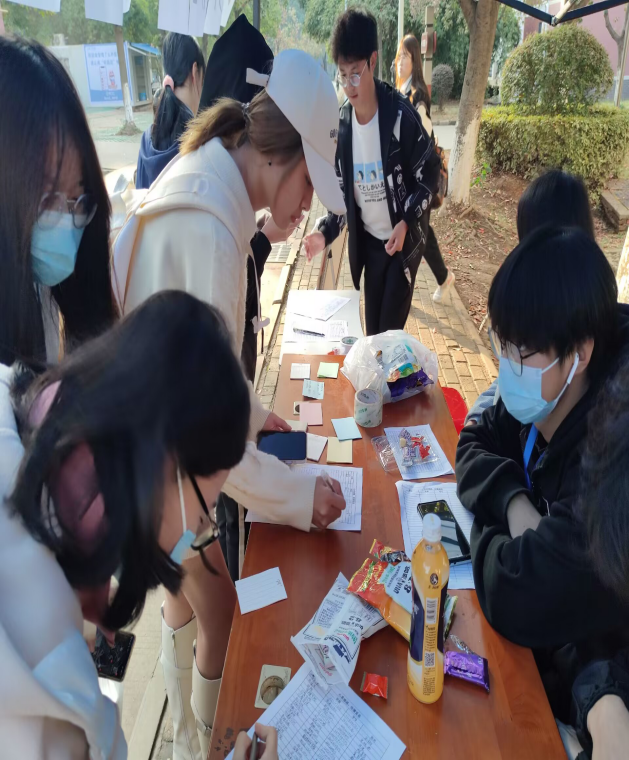 活动现场由i心苑工作人员负责向路过的同学宣传活动目的并引导参与活动的同学依次完成信息登记、想法收集等流程,同时也为参与活动的同学们准备了精美的小零食、小礼品。
