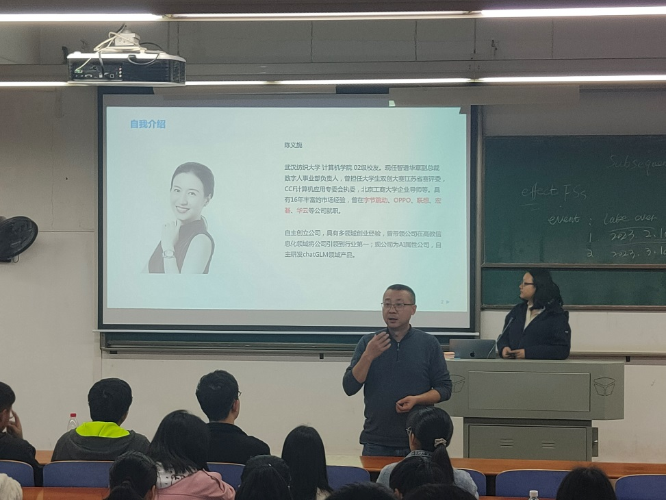 陈义旎从一名公司高管的角度对当前本科生的就业形式进行了详细分析,并结合自身经历讲述了国内外人工智能的发展前景,通过展示聊天机器、面试模拟器等实例,让同学们对人工智能这一领域的发展方向有更加深入的了解。