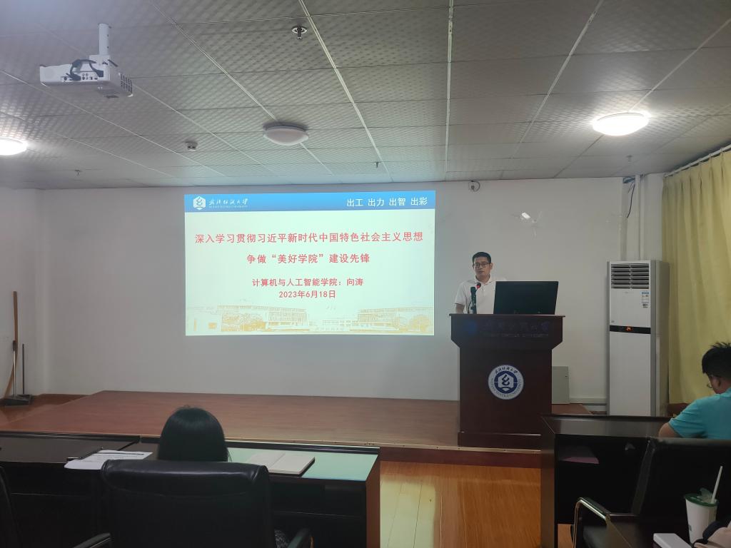 按照学校主题教育工作统一部署,6月18日晚,计算机与人工智能学院党委副书记向涛以《深入学习贯彻习近平新时代中国特色社会主义思想、争做“美好学院”建设先锋》为主题讲授专题党课,学院全体辅导员、全体团委学生会干部、学院研究生会干部、本科生学生代表、研究生学生党员代表等参加。
