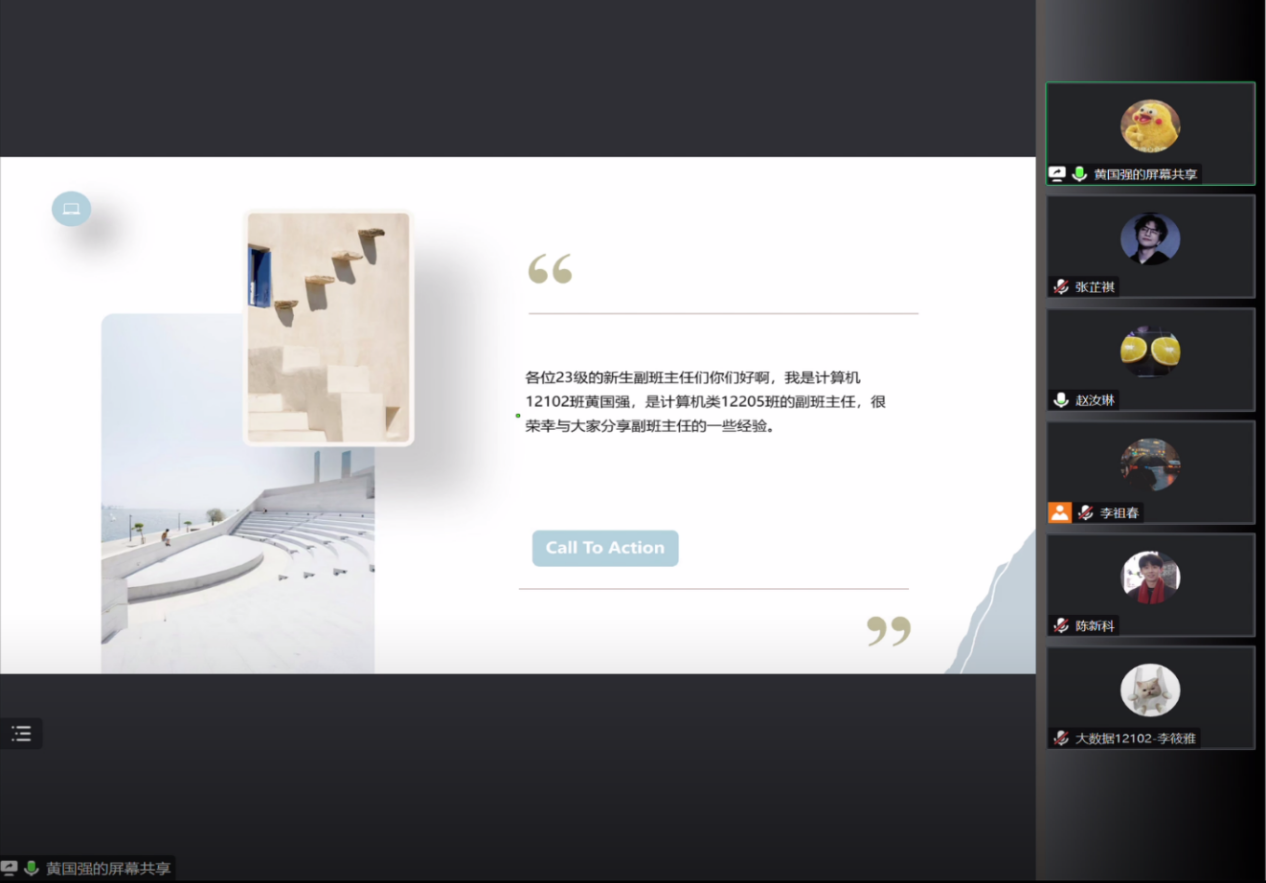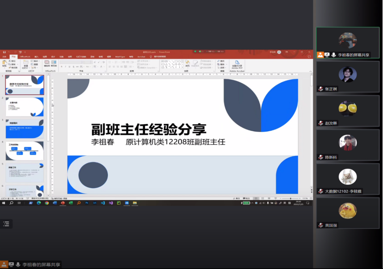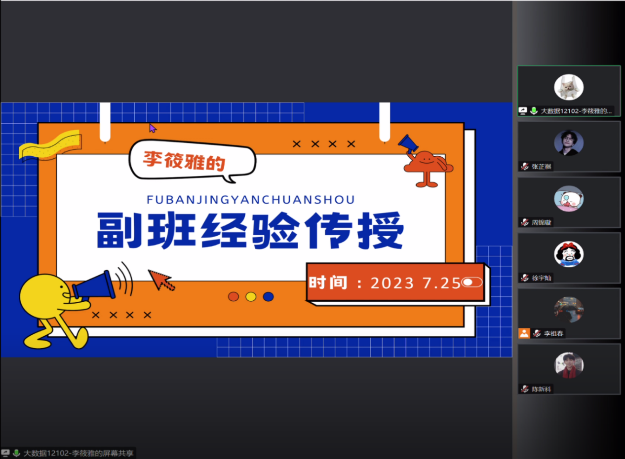 为帮助2023级副班主任尽快适应角色、熟悉工作、明确职责、提升工作能力,计算机与人工智能学院学生会团队于7月25日在线上开展了优秀副班主任经验分享会。本次分享会由五位2022级优秀副班主任以及2023级本科生辅导员易凡老师主讲,全体2023级副班主任成员参加,共同分享交流。