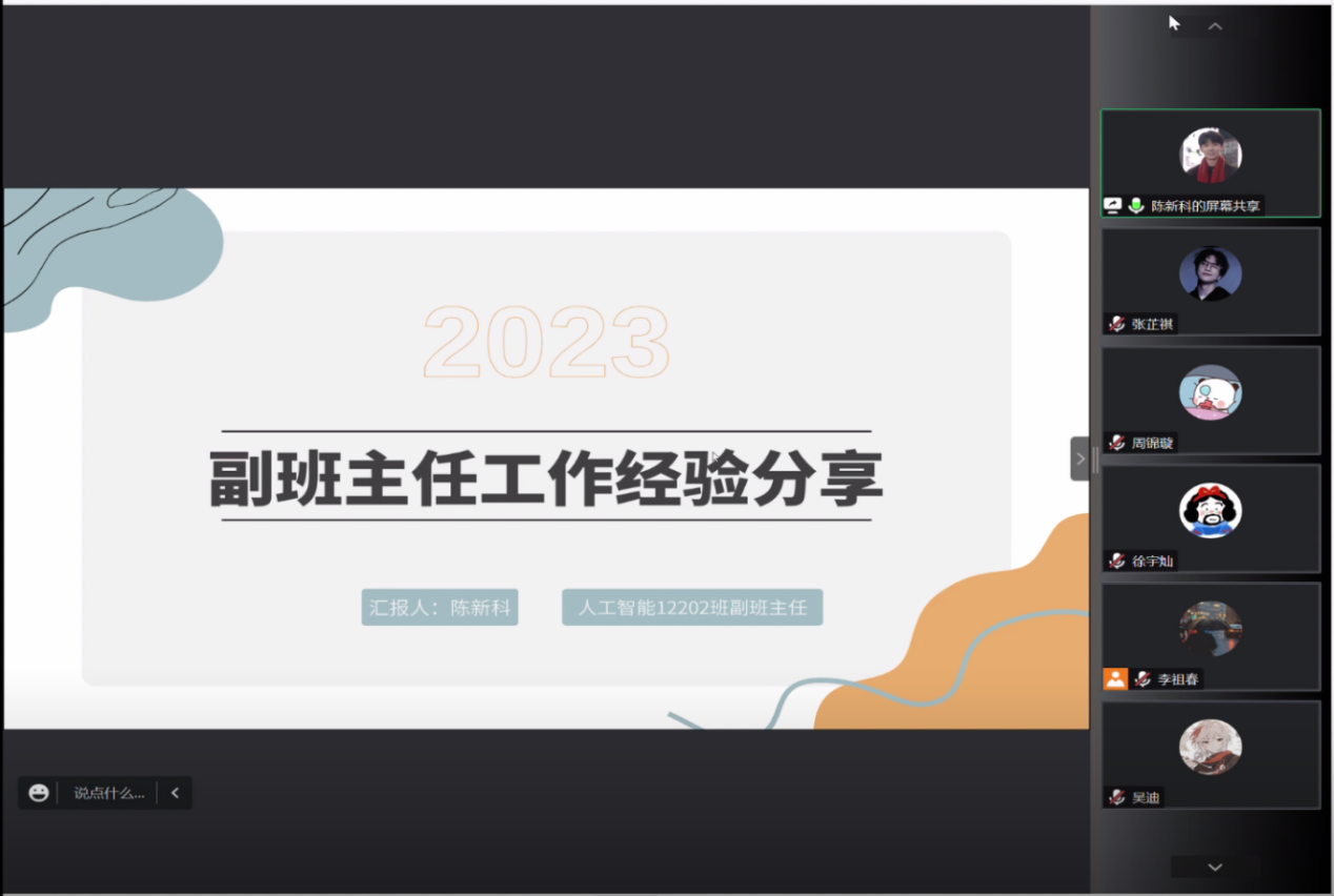 优秀副班主任代表陈新科强调副班主任在新生“开学初期”、“新生报到”、“正式接触”、“后续”四个时期的各项职责,详细介绍各时期任务需求及其细节还有难易程度,并以自身经验提出相关建议。例如新生网上报道会很麻烦,需要副班主任一个个督促。他总结自己的经验,为新生副班主任打好预防针,强调副班主任的言辞和正能量的重要性,同时也嘱咐新生副班主任要谨防新生进校时段的诈骗。希望新生副班主任们在班助工作中同新生班级相互学习,成就彼此更好的未来。