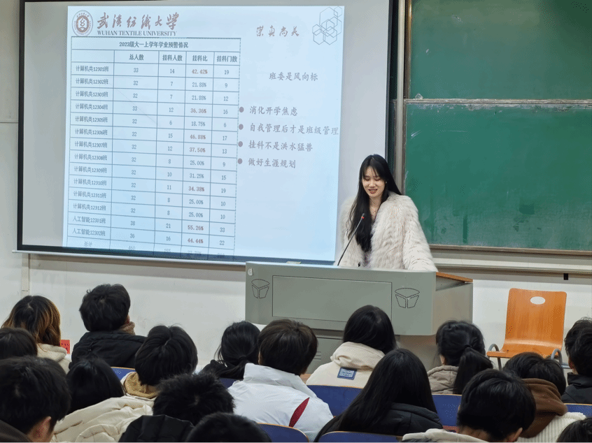 会议最后强调了本学期的几点工作重点:更加严格记录课堂考勤和大一年级的早晚自习考勤;更加经常进行查寝工作,做好寝室用电等安全的宣传工作;更加注重学风建设和学生个人成长;同时加强班级文化建设,提升班级凝聚力。
