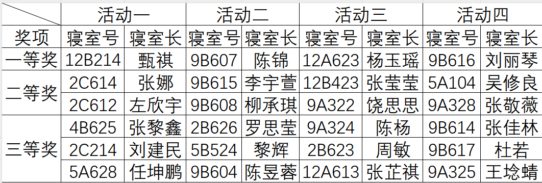 本届寝室文化节包含了“宿舍风采展”、“我们在寝室的一天”、“我的宿舍我定义”、“宿舍公约”四个活动,经过激烈角逐,共计24个寝室脱颖而出,成为“院文明寝室”,具体名单公示如下。
